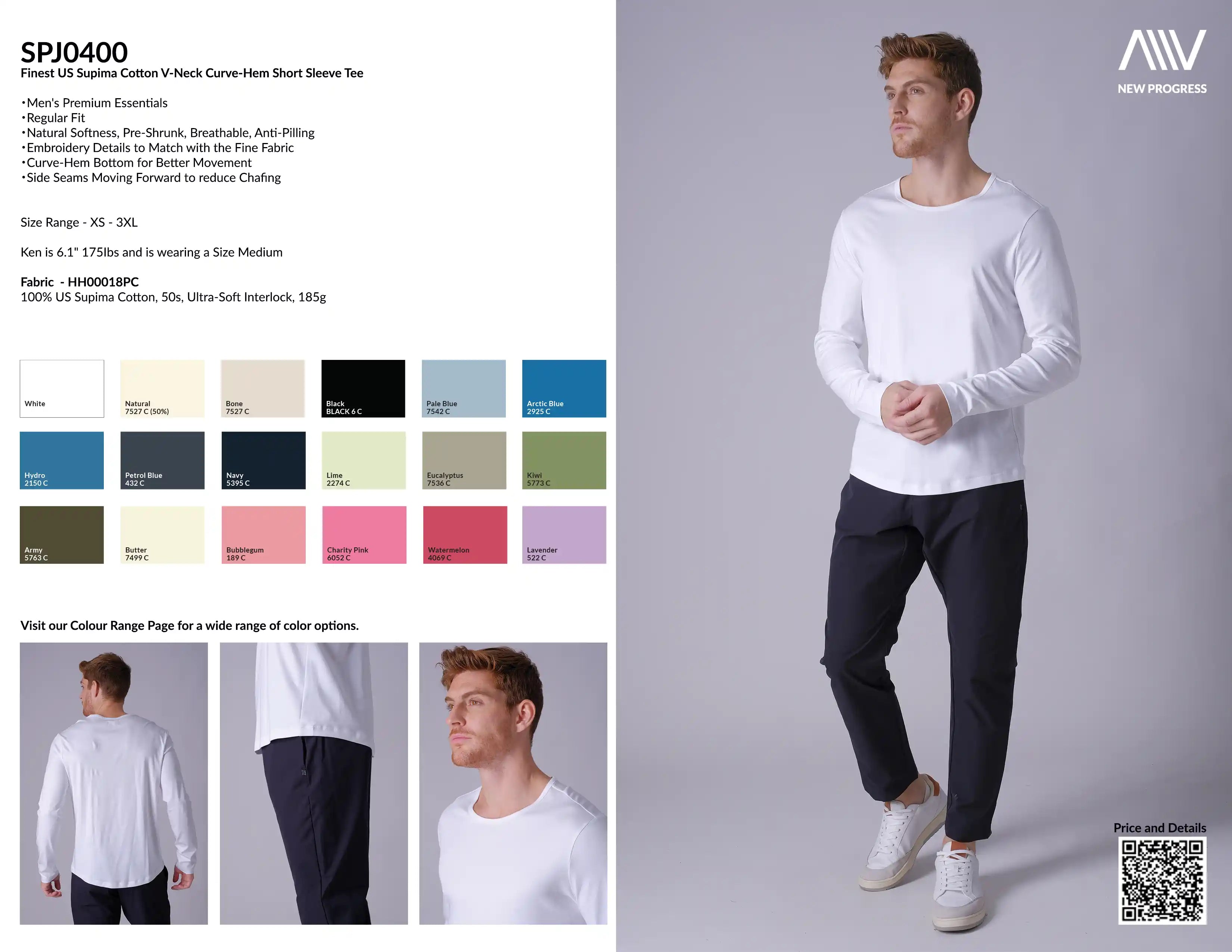 - 100% US Supima Cotton, 50s, Ultra-Soft Interlock, 185g