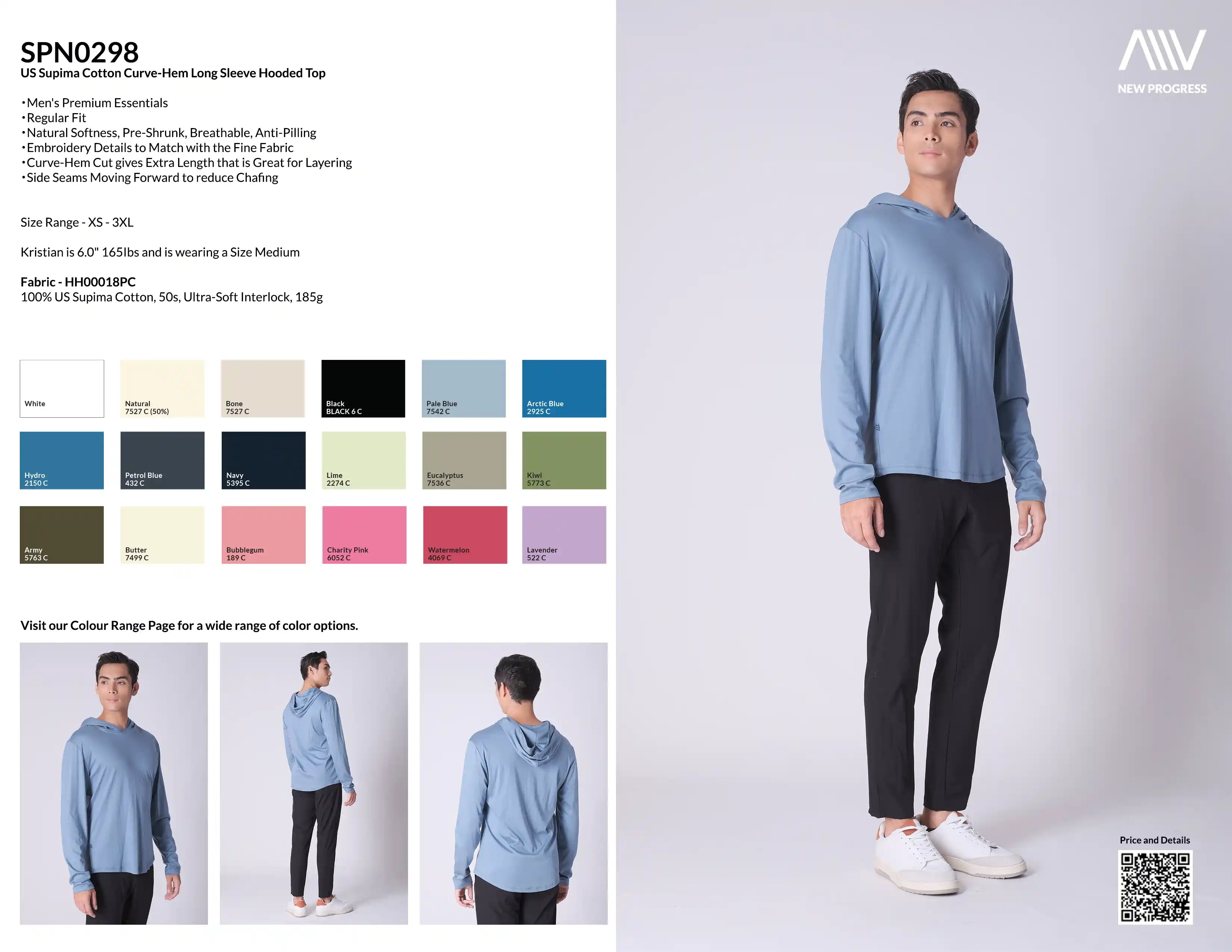 SPN0298 - Finest US Supima Cotton Curve-Hem Long Sleeve Hooded Top - Grey